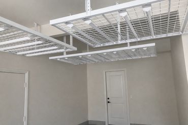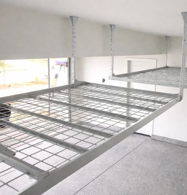 Ceiling-mounted overhead storage racks free up valuable garage floor space while keeping bins, sports gear, and seasonal items organized and easy to access. Built from heavy-duty steel with a durable powder-coated finish, our fixed racks are designed for strength, safety, and long-term reliability. Each 48" × 96" rack supports up to 450 lbs, turning unused ceiling space into practical, high-capacity storage.