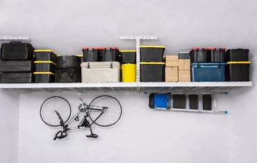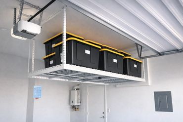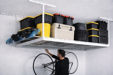Stop tripping over boxes and bins. Our overhead garage storage racks lift clutter off the floor and store everything safely overhead while keeping items easy to access.